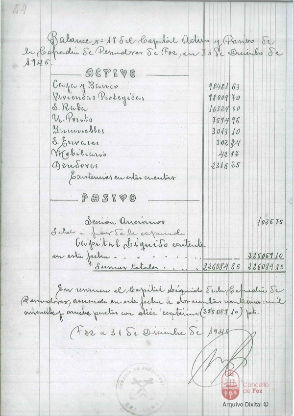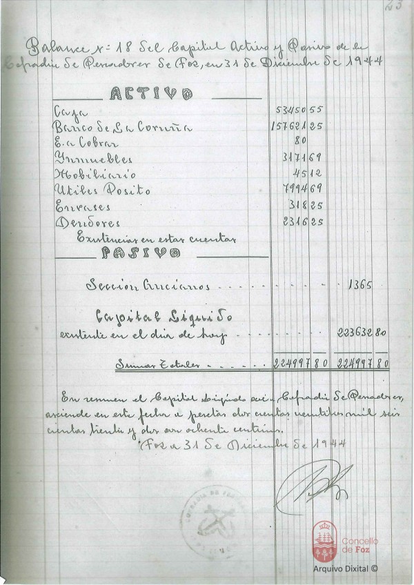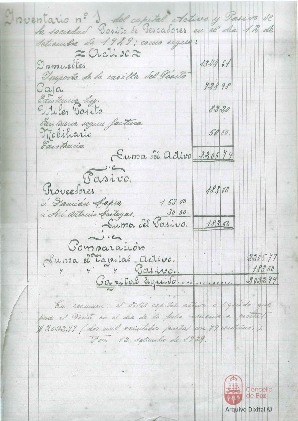 Inventario do capital activo e pasivo da Sociedade Pósito de pescadores. Cofradía de Pescadores