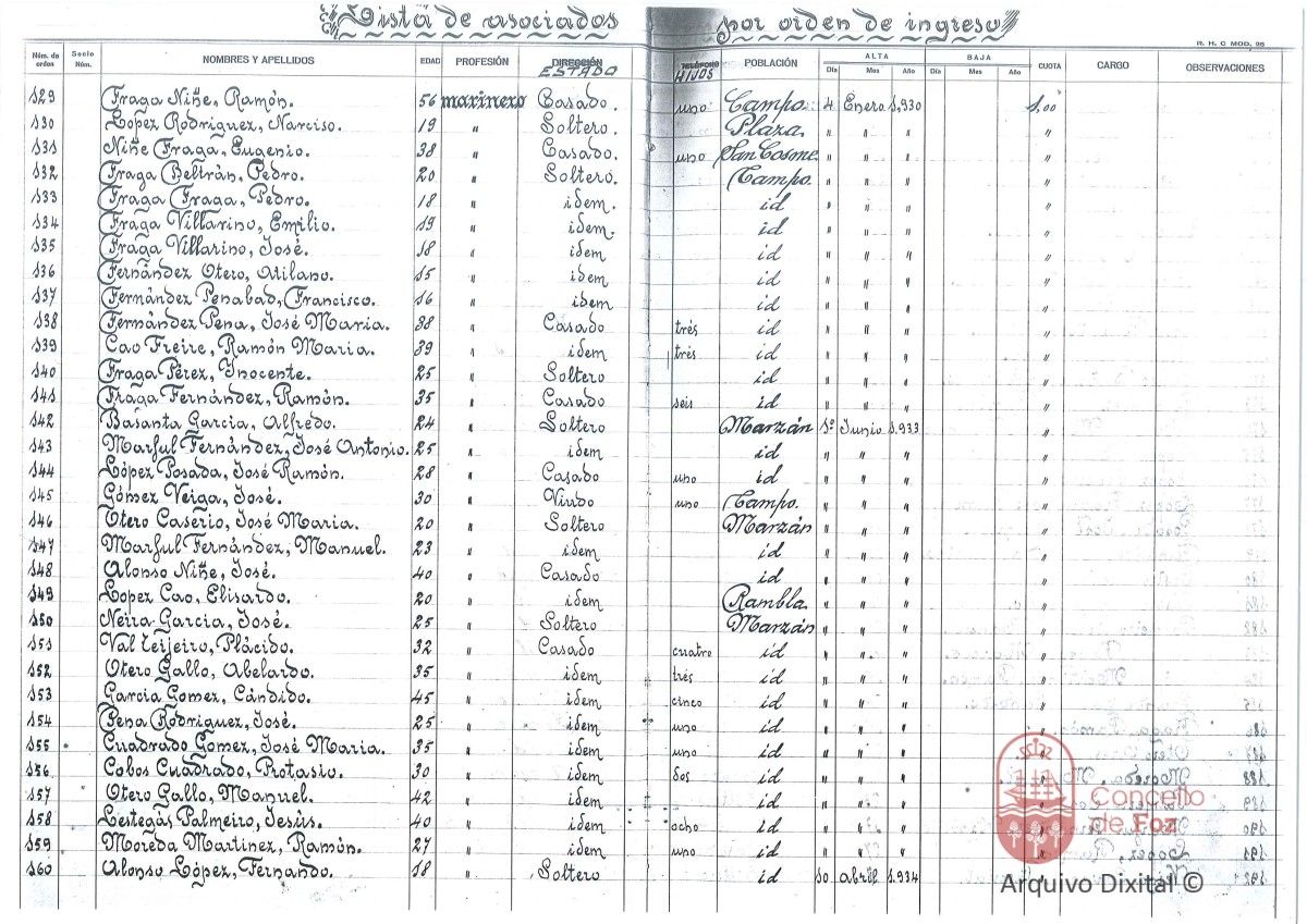 Listaxe de socios por orde de ingreso.