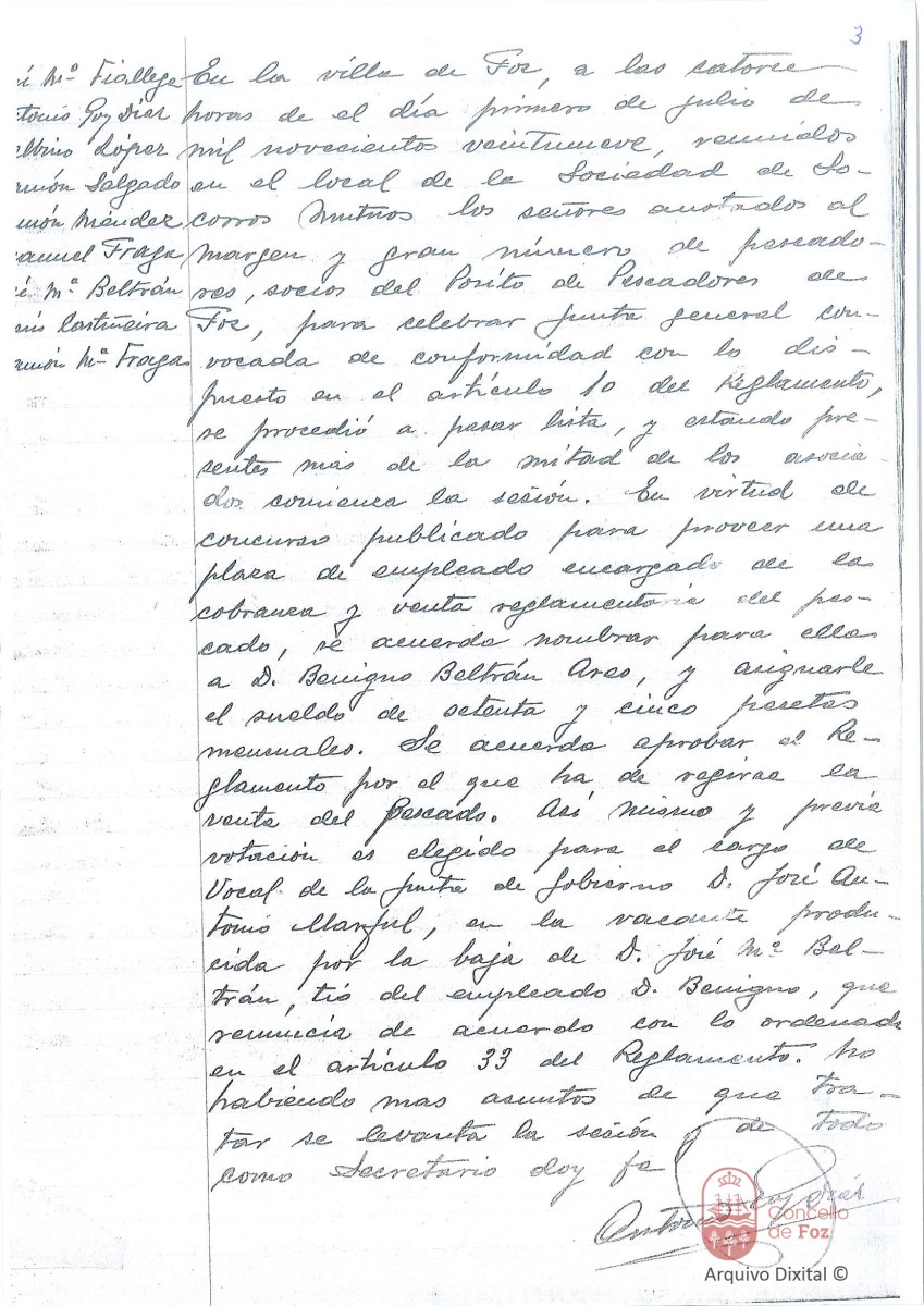 Acta da Xunta Xeral para proveer unha praza de empregado para a cobranza e venta do peixe.