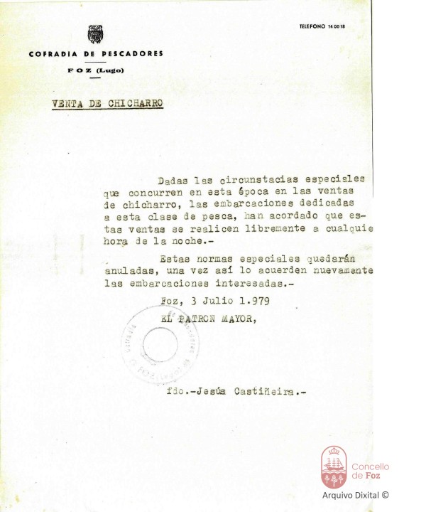 Notificación para a venda de chicharro Cofradía de Pescadores