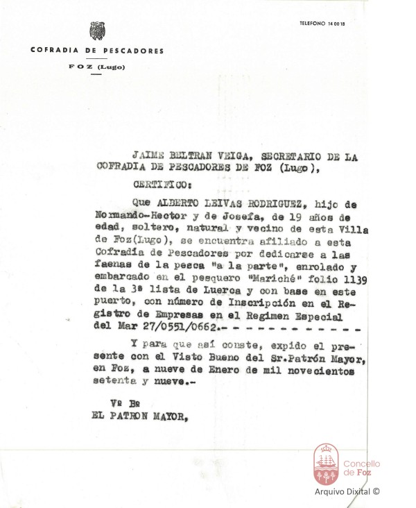 Certificado de afiliación de Dn. Alberto Leivas Rodríguez. Cofradía de Pescadores