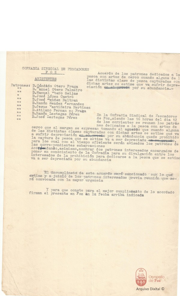 Acta de acordo dos patróns dedicados á pesca con artes de cerco. Cofradía de Pescadores