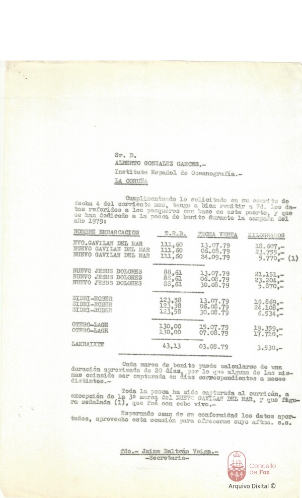 Relación de barcos pesqueiros, con base no porto de Foz que se dedicaron á captura do bonito durante a campaña 1979 Cofradía de Pescadores