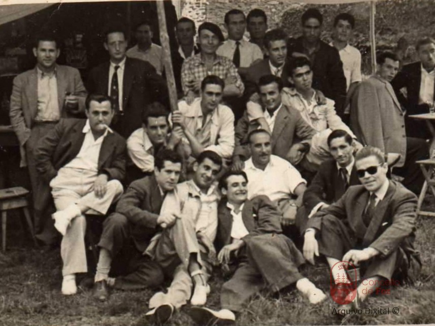 Á esquerda, sentado coas pernas cruzadas Zingla, seguinte sentado no chan, Barreiros, de chaqueta e tumbado, Amadito de Pachó, o de gafas Félix do Piloto, detrás, Manuel López (Chischás), detrás con camisa branca Suso Ares.