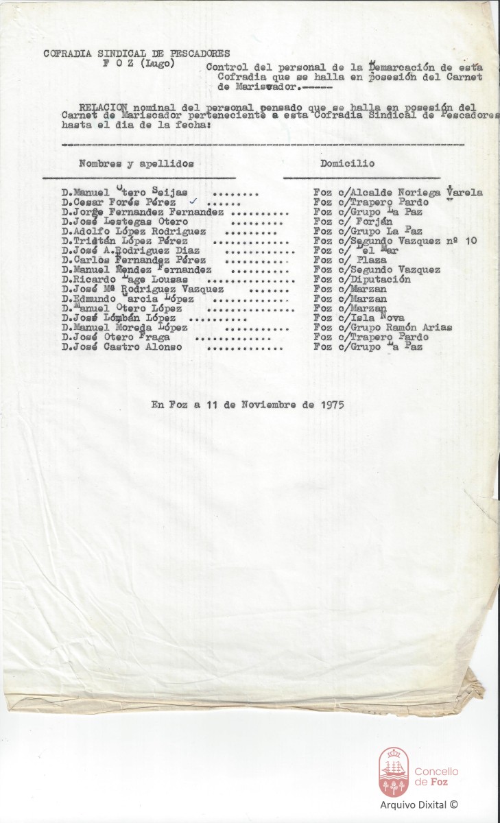 Relación do persoal censado, con carnet de mariscador, na Cofradía de Pescadores de Foz