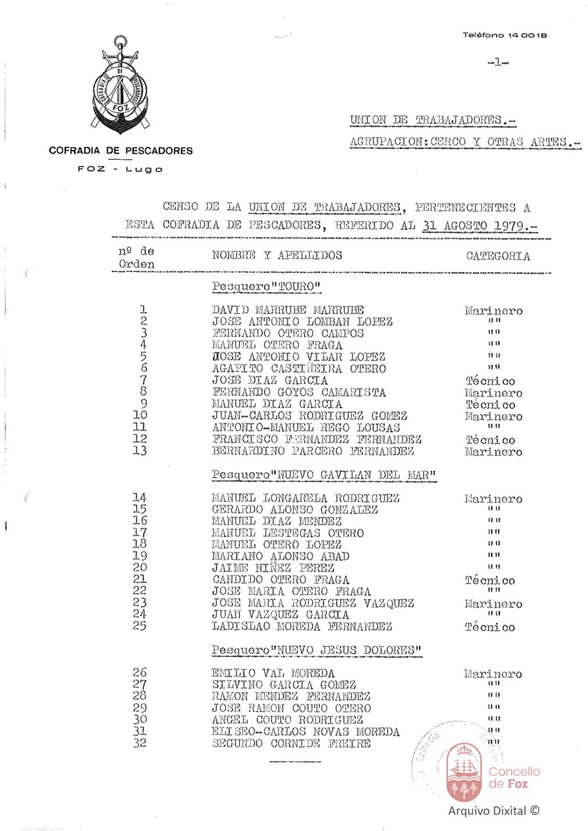 Eleccións ano 1979. Censo da Unión de traballadores pertencentes á Cofradía de Pescadores de Foz en data 31/08/1979