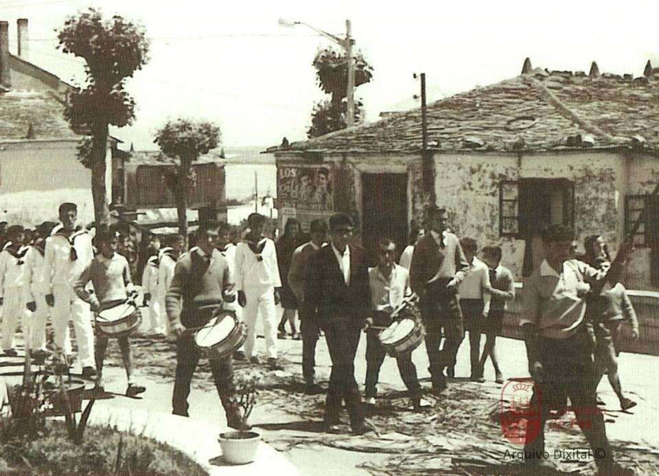 Dende o fondo, aparecen, vestido de mariño, Gonzalo da Aduana; co tambor, Abelardo de Donato; Chimplera; Antonio (soldadito), tocando o tambor; con garavata Antonio Ares; o da bandeira, Mochuelo.