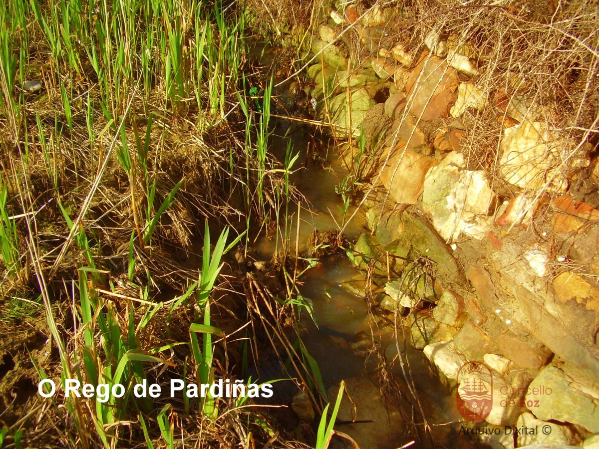A auga doce correndo. É curioso, os dous expertos en toponimia, Isaac Pérez do Valadouro e Xosé González de Viveiro, que interpretaros estes topónimos, eles nunca viron a zona esta, pero acertaron en todo, fixádevos nesta foto, o rego de Pardiñas, ten parede de pedra.