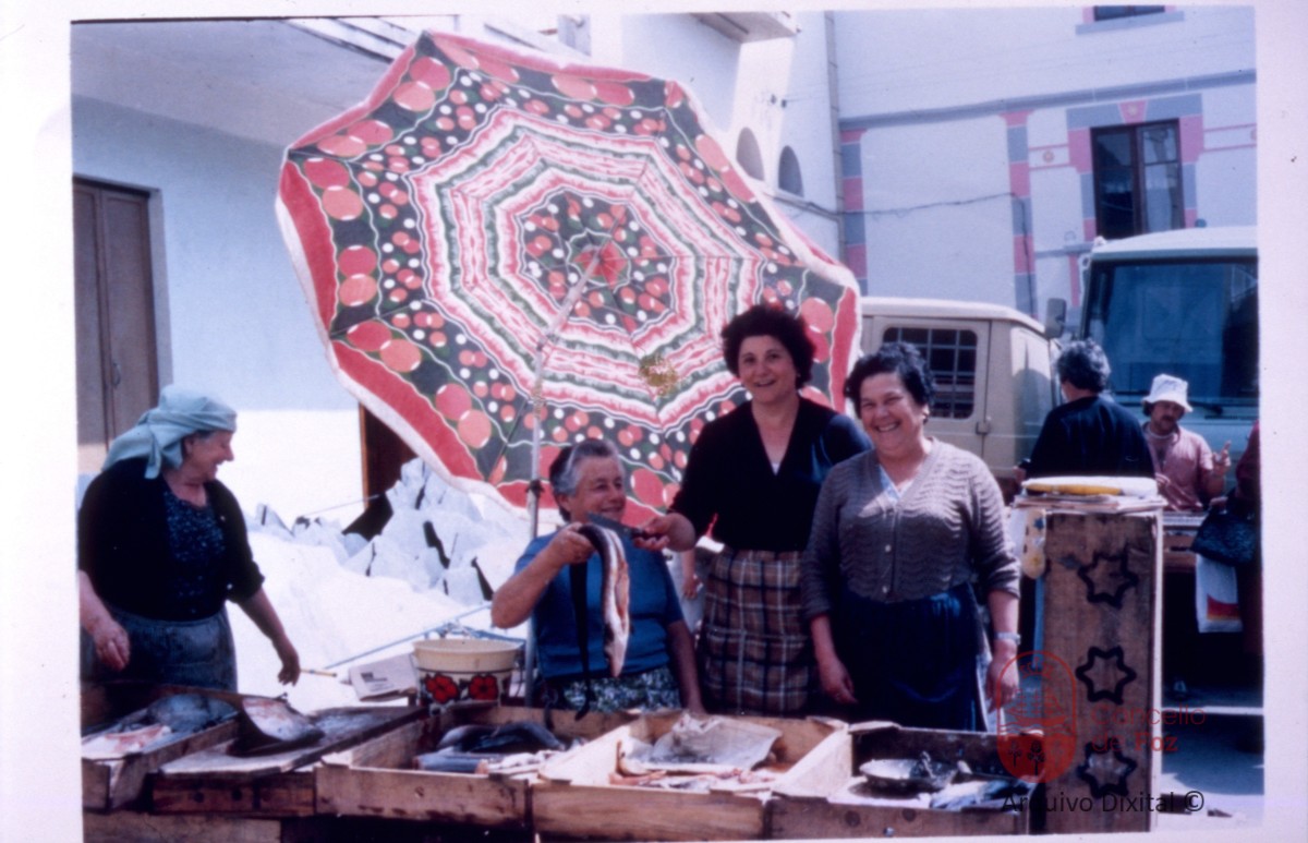 Onde se facía o antigo mercado semanal. Aparecen á dereita Otilia, segue Concha do Coyote e Susa da Canteira, collendo o peixe.