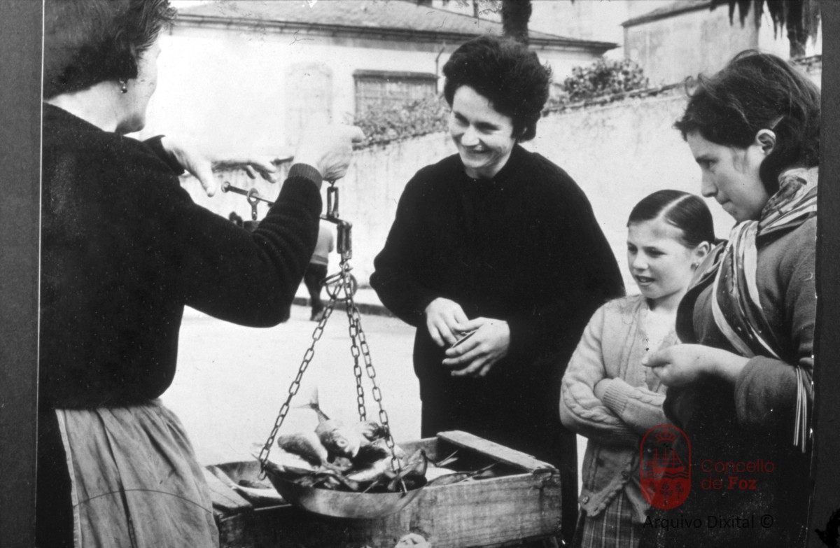 Pescantina pesando o chicharro coa romana no día de mercado.