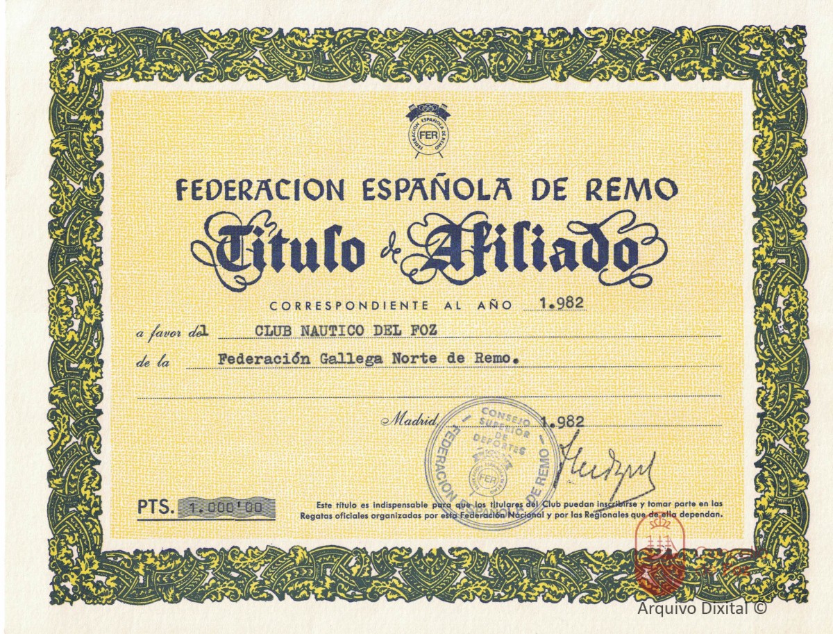Título de afiliado á Federación Española de Remo.