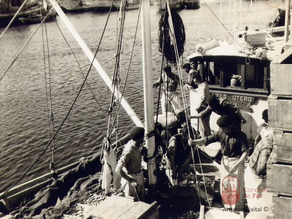 Tripulación do Ares Otero descargando bocarte no porto de Foz.