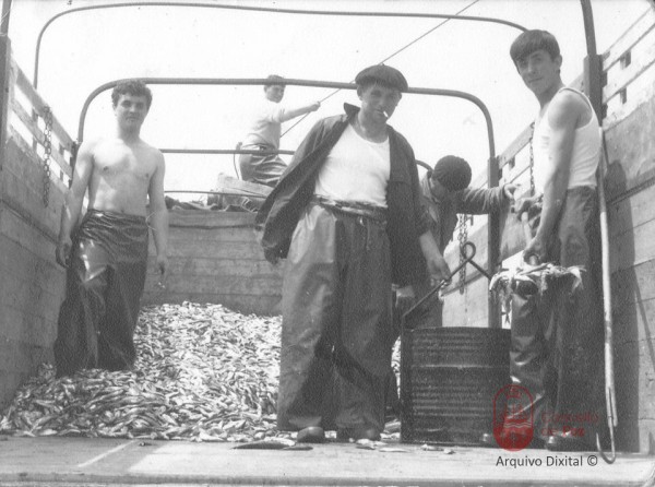 Cargando sardiña no camión para facer fariña. Os homes e o mar