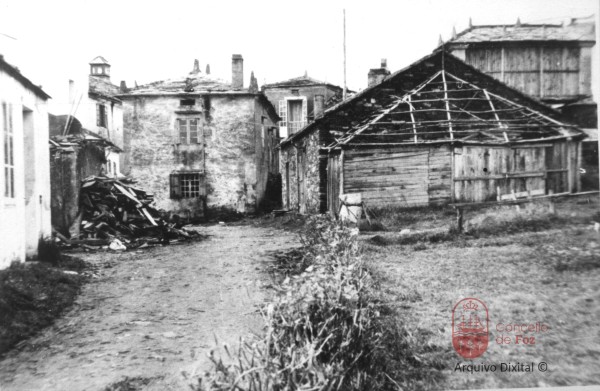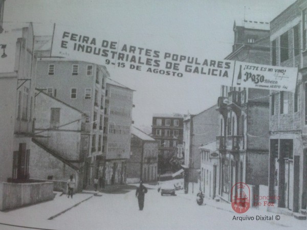 Avenida da Mariña coa pancarta da 1ª Feira de Arte Popular de Galicia O pobo de Foz